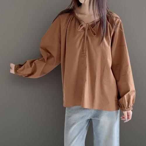 [신상오픈런]여성 리본 장식 브이넥 셔링 나그랑 면 블라우스 빅사이즈 (40946263)
