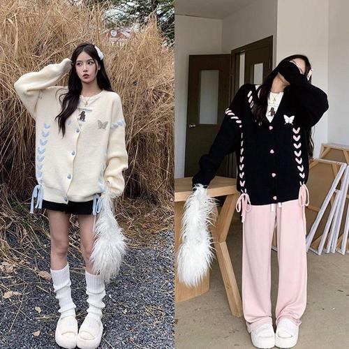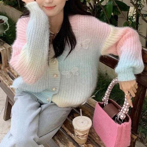 COSYEVNO 여성 니트 가디건 봄가을 단추 나비 자수 루즈핏 코트 니트