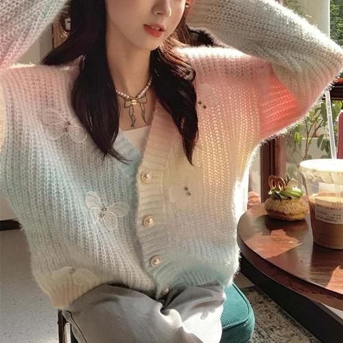 여성 나비 스팽글 부드러운 브이넥 긴팔 스웨터 카디건 데일리 루즈핏 봄 가을 니트 가디건 여자기디건 여자스웨터