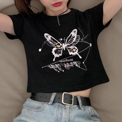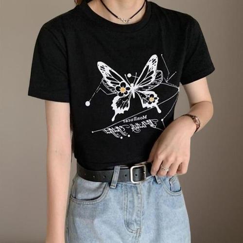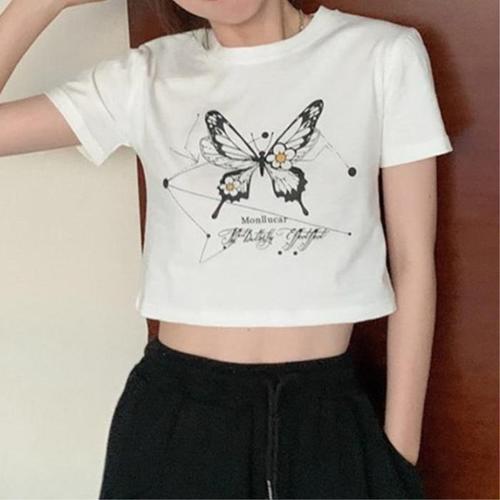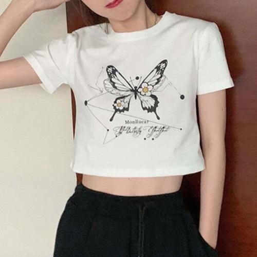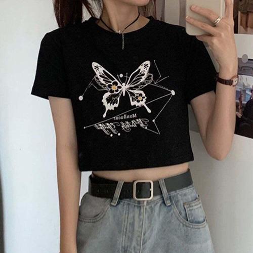 [신상오픈런]여성용 크롭 라운드넥 반팔티 나비 패턴 스포츠 스타일 (39096425)