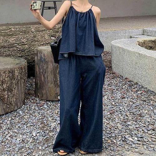 [에이치플러스몰]와이드 끈나시 투피스 빈티지 상하세트 캐주얼 바캉스