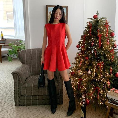 [신상오픈런]페플럼 라운드넥 a라인 슬리브리스 스웨이드 미니원피스 (29414809)