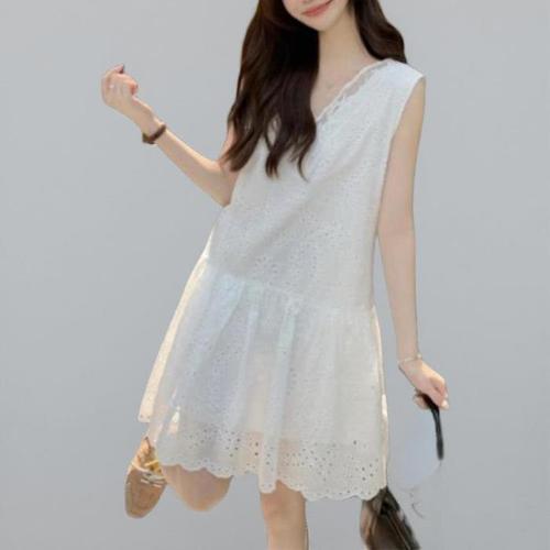 [신상오픈런]여성 화이트 민소매 미니 원피스 펀칭 레이스 자수 드레스 (37006382)