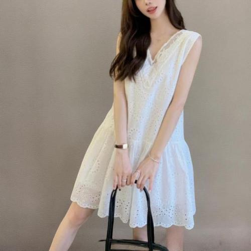 [신상오픈런]여성 민소매 미니 원피스 화이트 펀칭 레이스 자수 드레스 (37001198)