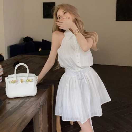 옷자락 / 여자 유니크 홀터넥 민소매 벨티드 미니 원피스
