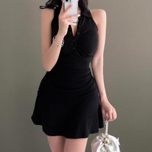 [신상오픈런]여자 워터밤 단가라 민소매 카라 셔링 글램 미니원피스 (36388568)