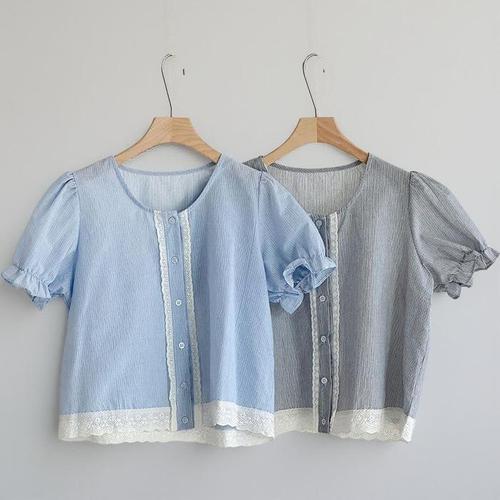 [신상오픈런]여성 스트라이프 펀칭 레이스 퍼프 소매 셔츠 하객 패션 (35832053)