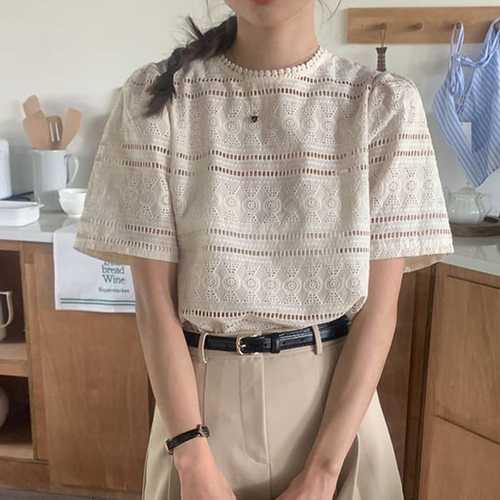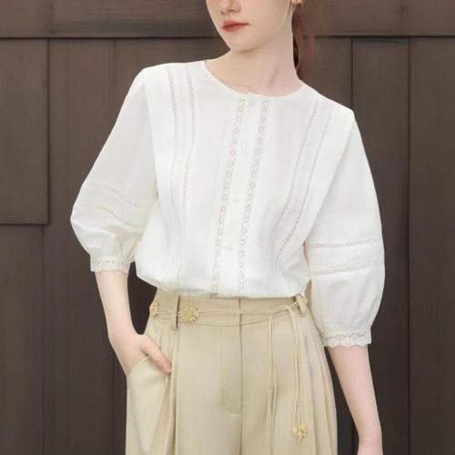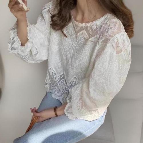 [신상오픈런]여성 펀칭 레이스 패턴 시스루 화이트 블라우스 (35401931)
