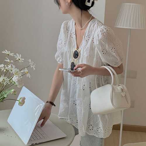 슈팅스타 / 브이넥 퍼프소매 펀칭 레이스 블라우스 1078349