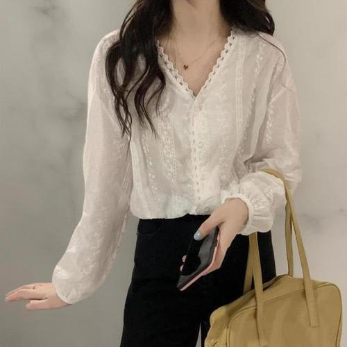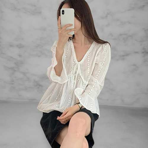 [신상오픈런]여성용 화이트 브이넥 긴팔 레이스 블라우스 펀칭 디자인 (40953114)