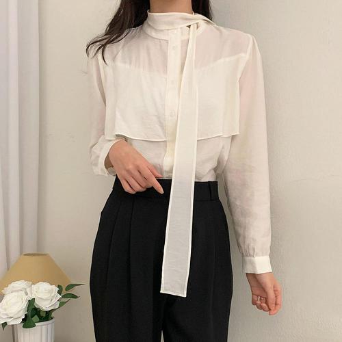 [옷자락]여자 롱타이 가을하객룩 버튼 시스루 날개 블라우스