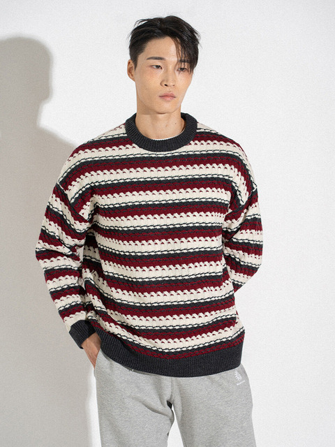 [헬리오스] STRIPE ROUND-NECK KNIT_BURDUNDY