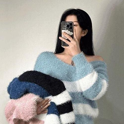 [에이치플러스몰]단가라 스트라이프 캐주얼 퍼 니트 필수템 티 앙고라