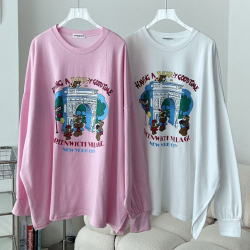FONOW 남녀공용 오버핏 심플 삐친 곰 프린팅 맨투맨 긴팔 티셔츠 후드티