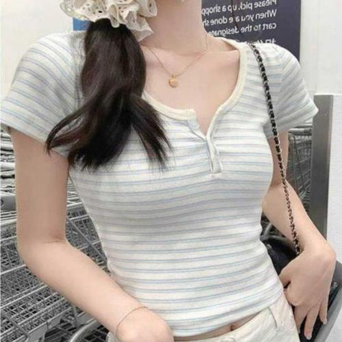 [에이치플러스몰]스트라이프 인기 슬림핏 크롭 반팔 감성 티셔츠 여름