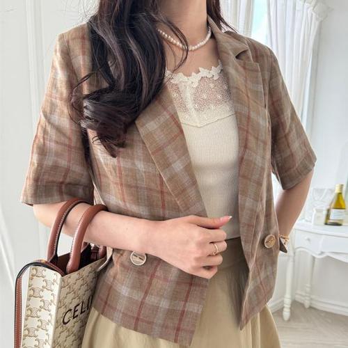 [쉬즈미스][쉬즈미스(SHESMISS)] 프리미엄소재 체크 패턴 린넨 재킷 (택가격 398000원)