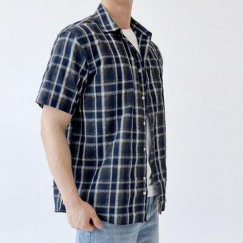 [셀러허브_여성트랜드패션]남방 린넨 여름 티셔츠 남성 오버핏 반팔 체크 셔츠