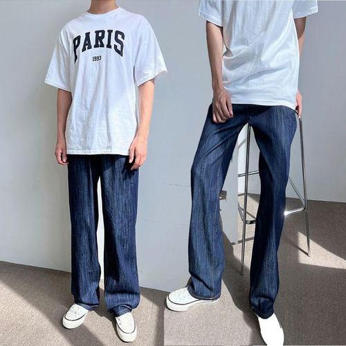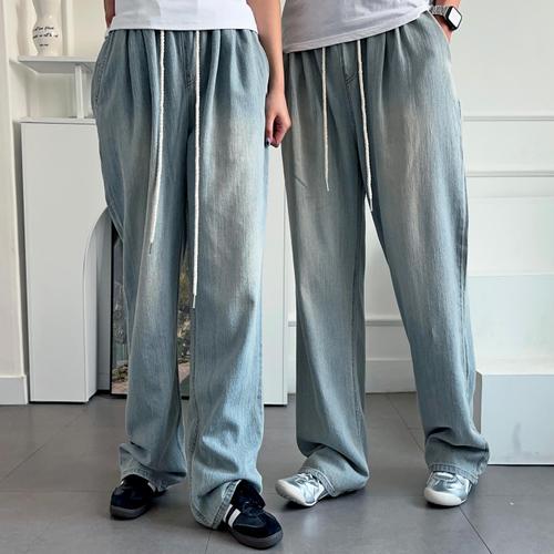 [에이치플러스몰]남자 린넨 여름 청바지 와이드 핏 데님 밴딩 팬츠