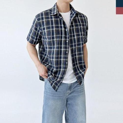 [셀러허브_여성트랜드패션]반팔 남자 남방 체크 HL] 오버핏 린넨 셔츠 여름