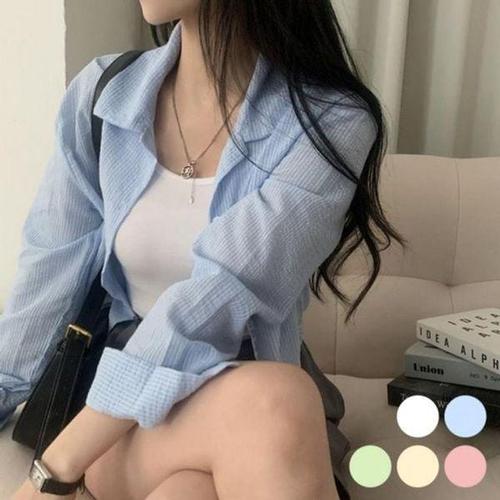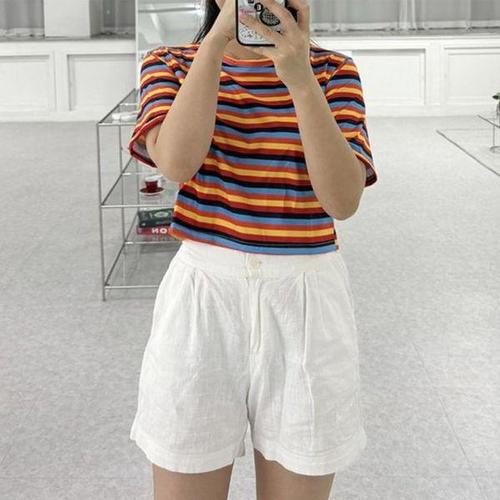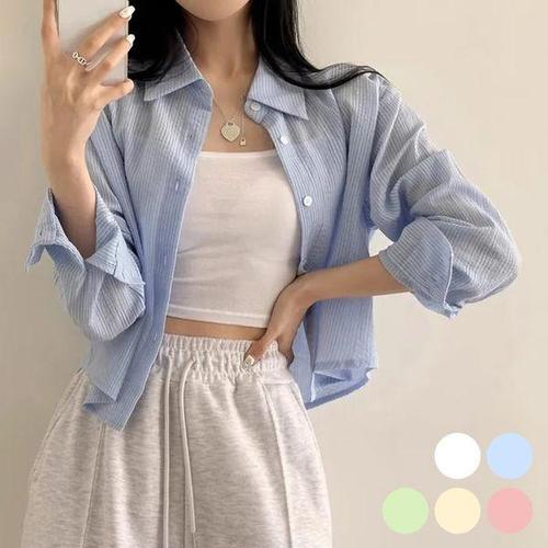 [에이치플러스몰]셔츠 스트라이프 추천 크롭티 데일리룩 꾸안꾸 상의