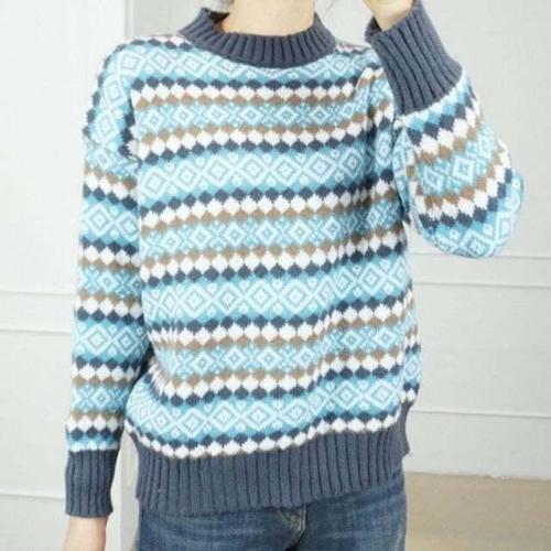 [셀럽하우스]니트 WQDP8049 라운드넥 소프트 긴팔 에스닉 캐쥬얼 티셔츠