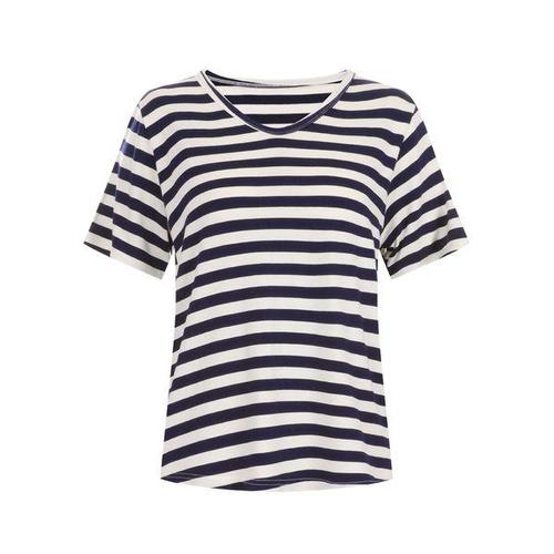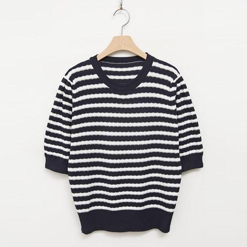 여성 라운드 단가라 잔가로줄 캐주얼 반팔 니트티 DGB-WKN-4729-네이비