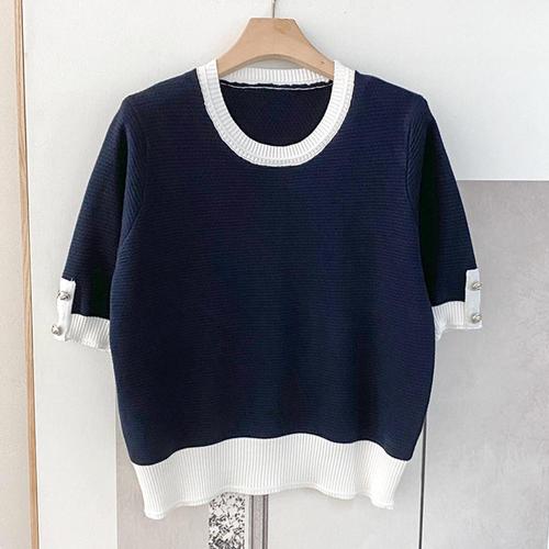 여성 배색 라운드 소매 단추 반팔 니트 티셔츠 DGB-WKN-4315-네이비