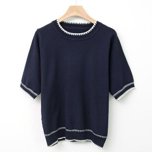 여성 라운드넥 배색 반팔 니트 티셔츠 DGB-WKN-4313-네이비