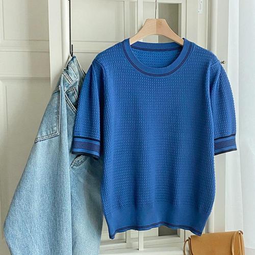 국산 여성 라운드넥 단가라 면사 100 반팔 니트 티셔츠 21DS-WKN-4386-네이비