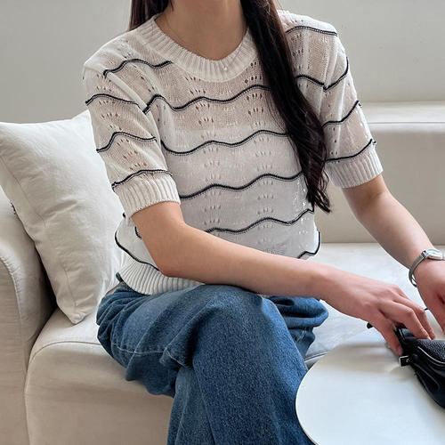 국산 여성 웨이브 줄무늬 펀칭 반팔 니트티셔츠 21DS-WKN-4614-네이비