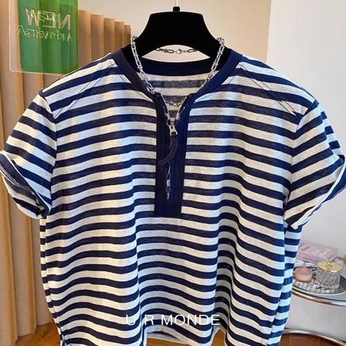 [보니제이]단가라 네이비 여성 반팔티 앞 지퍼 포인트 라운드 스