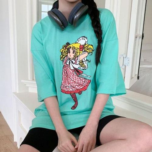 [에이치플러스몰]루즈핏 노랑머리 삐삐 굿모닝 반팔 롱 티셔츠 홈웨어