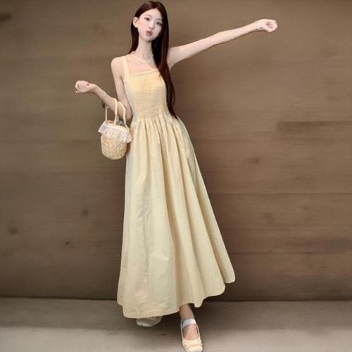 [신상오픈런]여성용 사랑스러운 코튼 원피스 어깨끈 노란색 롱드레스 (37001148)