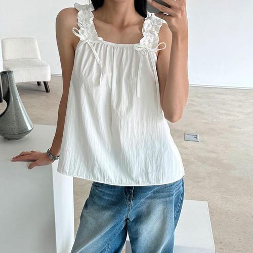 [신상오픈런]여성 리본 장식 프릴 밴딩 셔링 A라인 나시 탑 노란색 하늘색 (38642041)