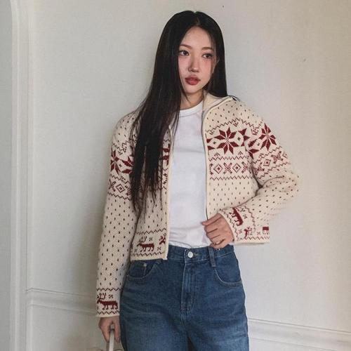 [신상오픈런]노르딕 눈꽃 루돌프 사슴가디건 하이넥 크롭집업 (28833064)