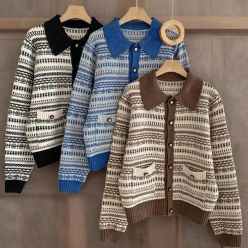 [신상오픈런]여자 캐주얼 노르딕 줄지 단추 카라넥 니트 가디건 (41369283)
