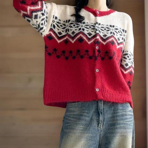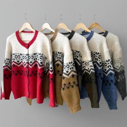 [신상오픈런]여성 노르딕 눈꽃 패턴 배색 브이넥 오버사이즈 겨울 가디건 (41913397)