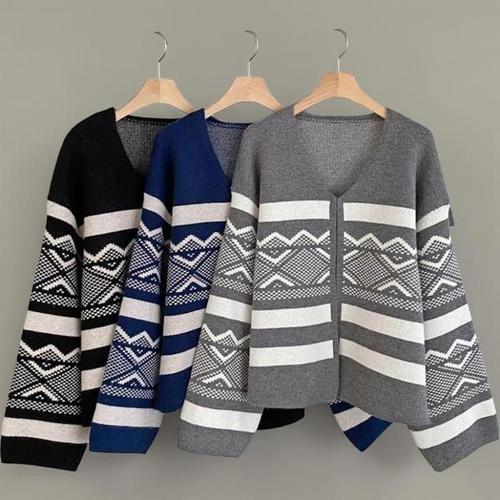 [신상오픈런]여성 노르딕 디자인 배색 라운드넥 포인트 쟈가드 니트 가디건 (41564114)