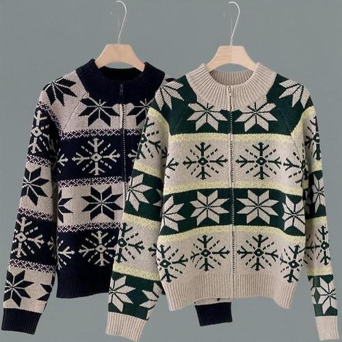 [신상오픈런]여성 눈꽃 패턴 노르딕 쟈가드 배색 집업 니트 가디건 (42636322)