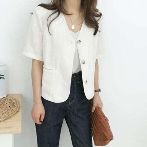 [셀럽하우스]린넨반팔자켓 TTKX7067 크롭 브이넥 노카라 여름 여성 재킷