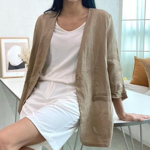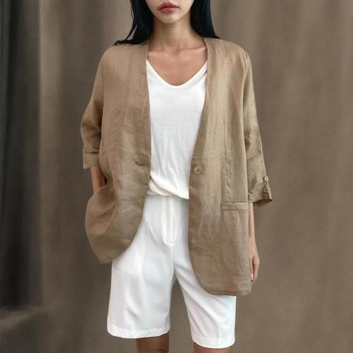 [신상오픈런]여성용 무지 컬러 진주 장식 5부 소매 노카라 린넨 자켓 (34574798)