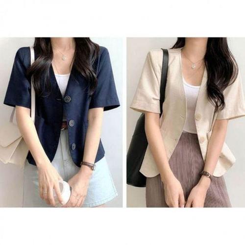 [에이치플러스몰]여름 인기 여성 브이넥 노카라 감성 린넨 반팔 자켓