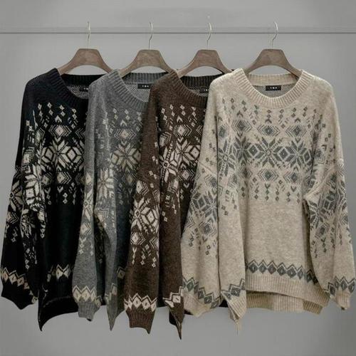 [신상오픈런]여성 눈꽃 패턴 노르딕 스타일 가을 겨울 오버사이즈 긴팔 라운드 니트 (41265861)