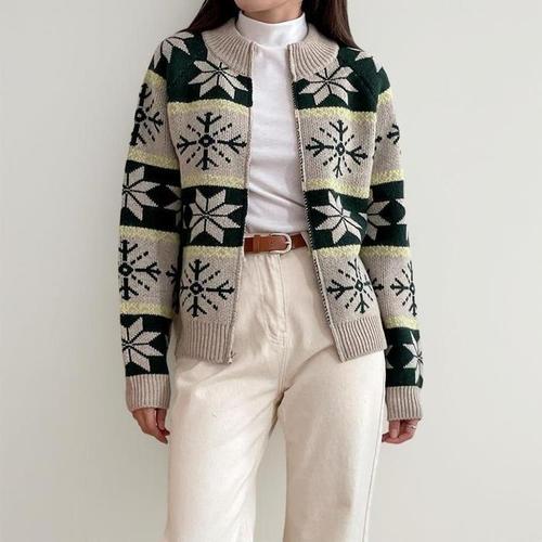 [신상오픈런]여성 눈꽃 패턴 노르딕 쟈가드 배색 집업 니트 가디건 (42636322)