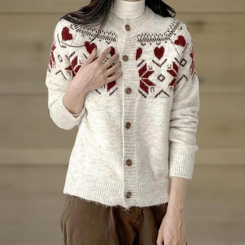 [신상오픈런]여성 하트 눈꽃 패턴 배색 나그랑 라운드넥 카디건 (42510328)