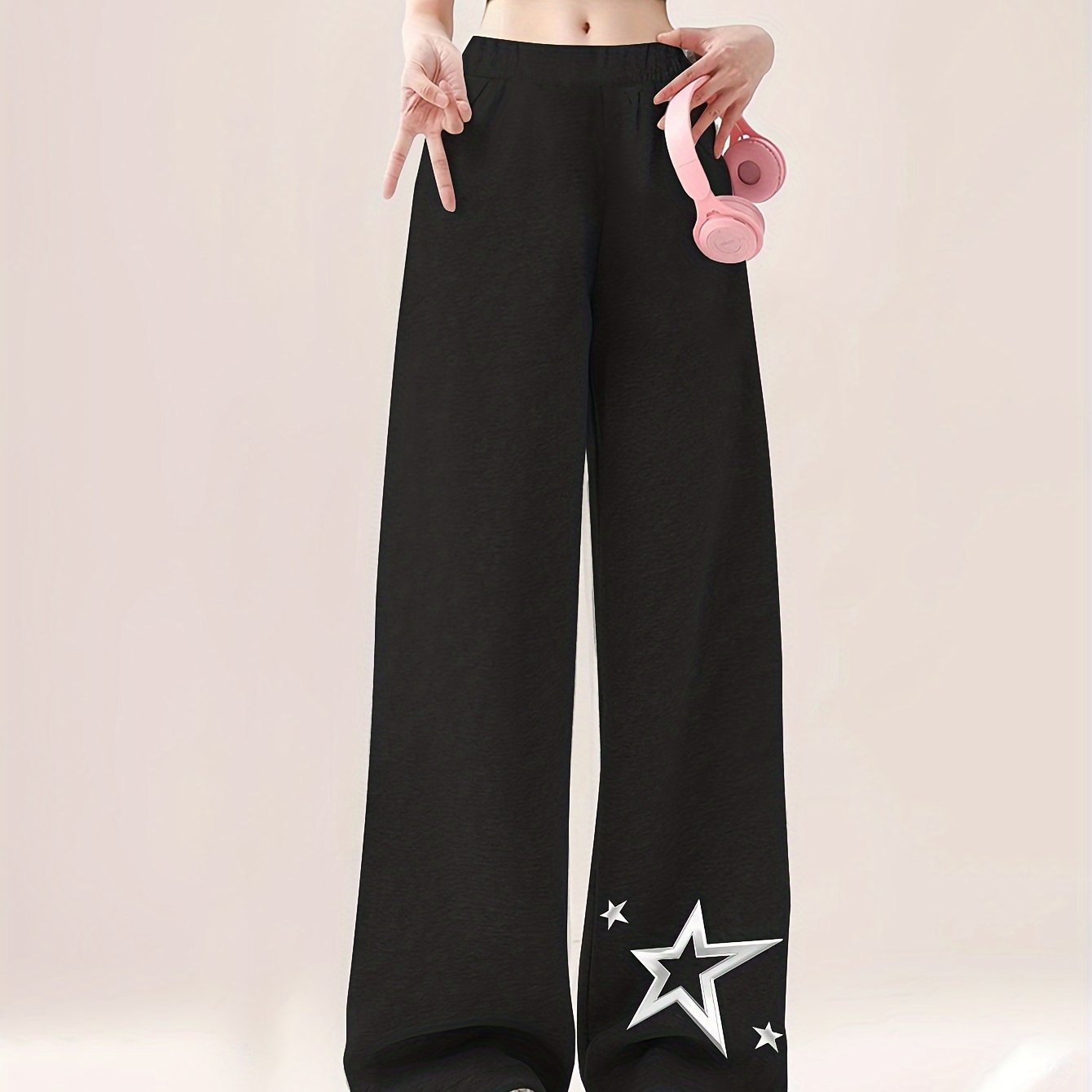 TEMU 여아용 캐주얼 패션 블랙 와이드 레그 팬츠 별 프린트 - 부드러운 폴리에스터, 세탁기 사용 가능, 가을/겨울에 완벽, 야외 활동에 적합