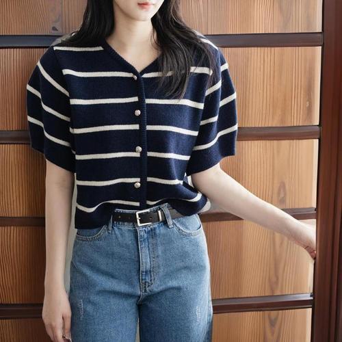 [신상오픈런]여성 브이넥 단추 반팔 니트 가디건 벌룬소매 스트라이프 (33139016)