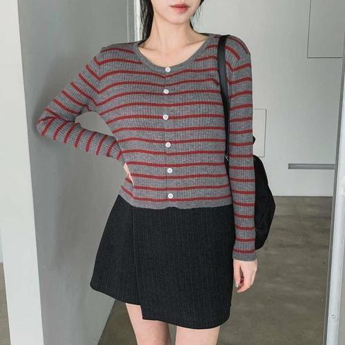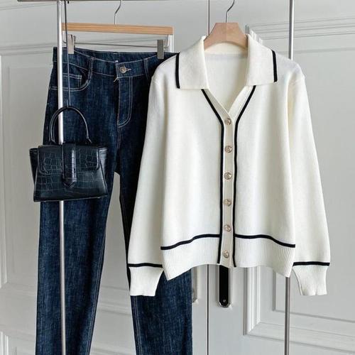 [신상오픈런]여성 심플 배색 단가라 슬림핏 단추 니트 가디건 (43165267)