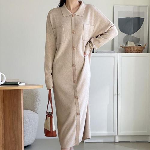 [신상오픈런]카라 오픈 골지 앞단추 긴팔 맥시 루즈핏 니트원피스 (30953624)