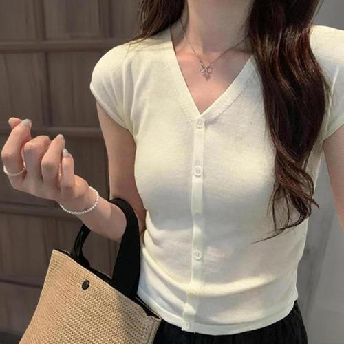 [신상오픈런]여성용 브이넥 슬림핏 반팔 니트 가디건 단추 디테일 (40953130)